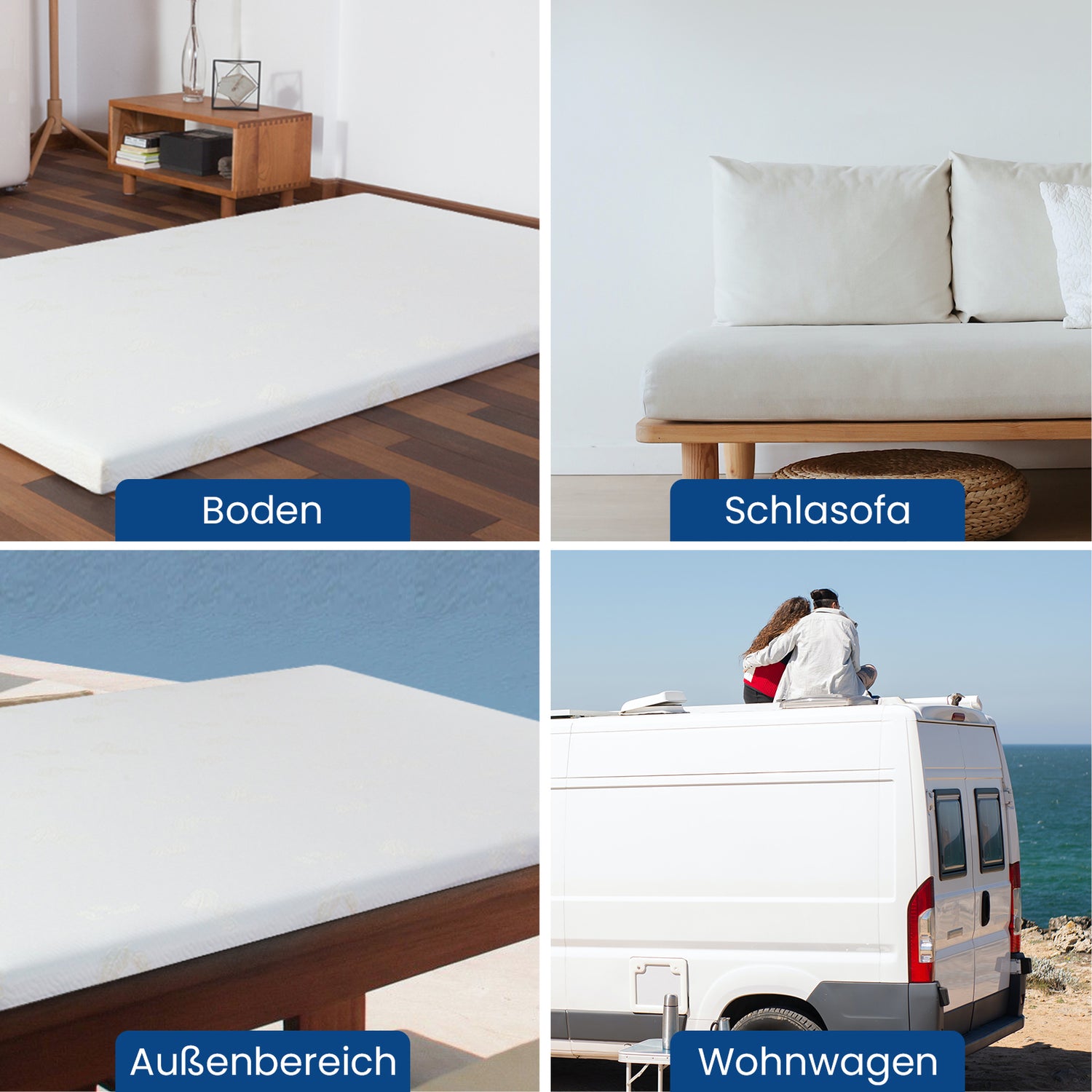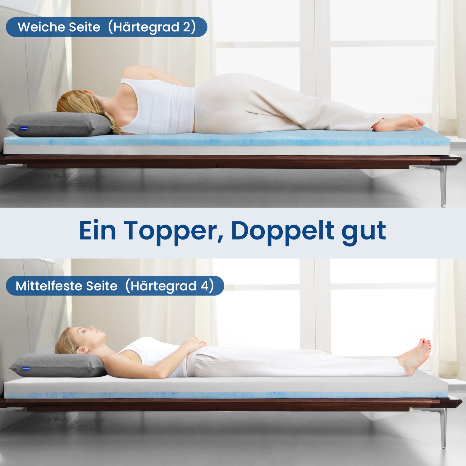 Es gibt keine Ober- und Unterseite, aber unsere Matratzenauflage besteht aus zwei Schichten: Die obere Schicht besteht aus Gel-Visko-Schaum und die untere Schicht aus Komfortschaum.