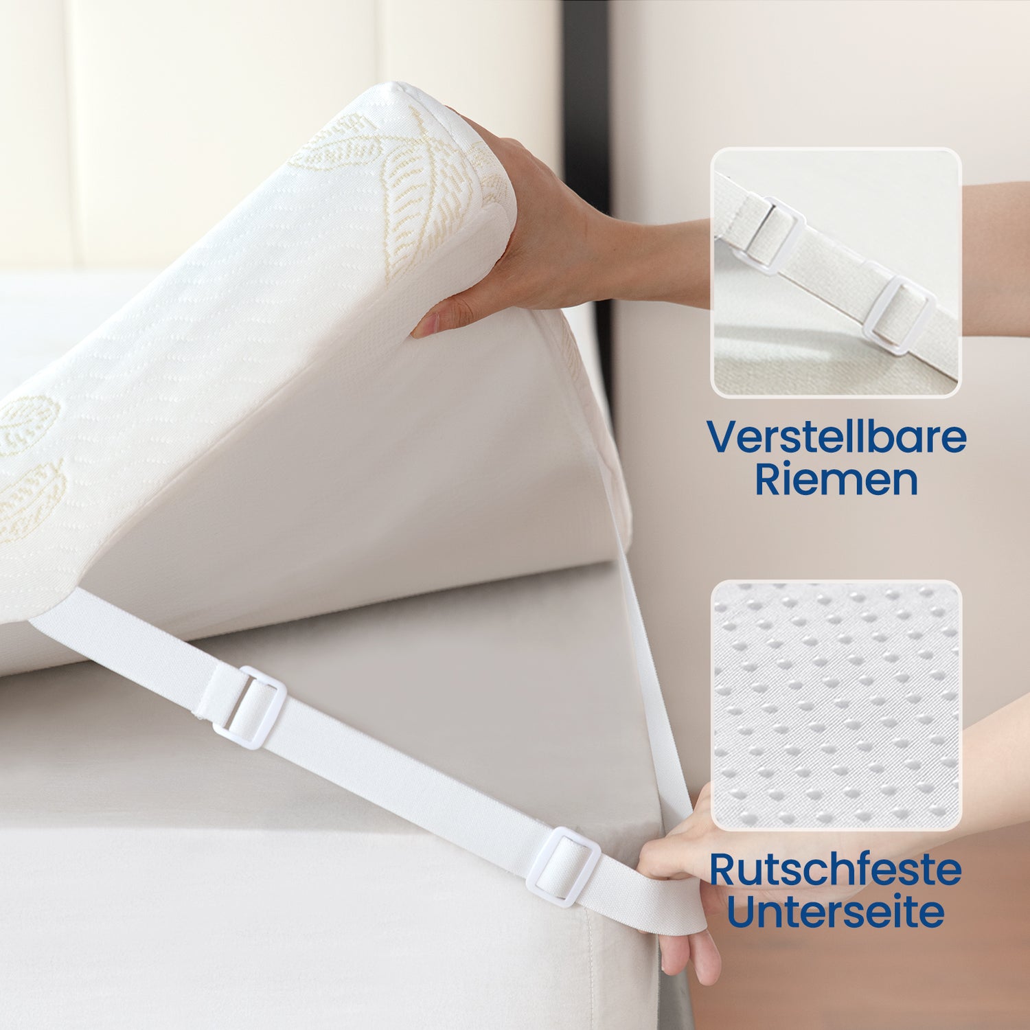 Die Unterseite der Matratzenauflage verfügt über ein rutschfestes Noppendesign, das in Kombination mit einem verstellbaren Gummiband für einen sicheren Halt auf der Matratze sorgt.