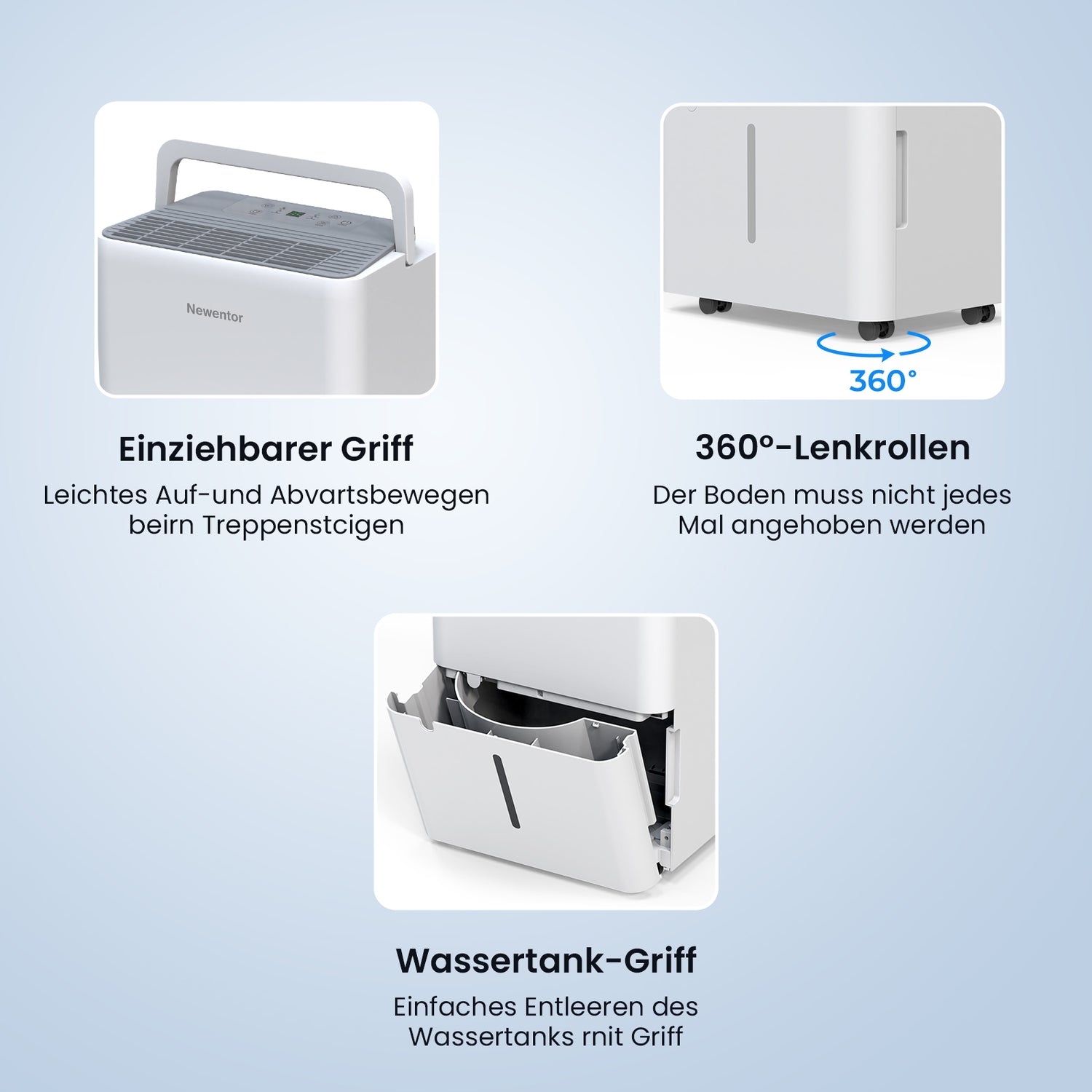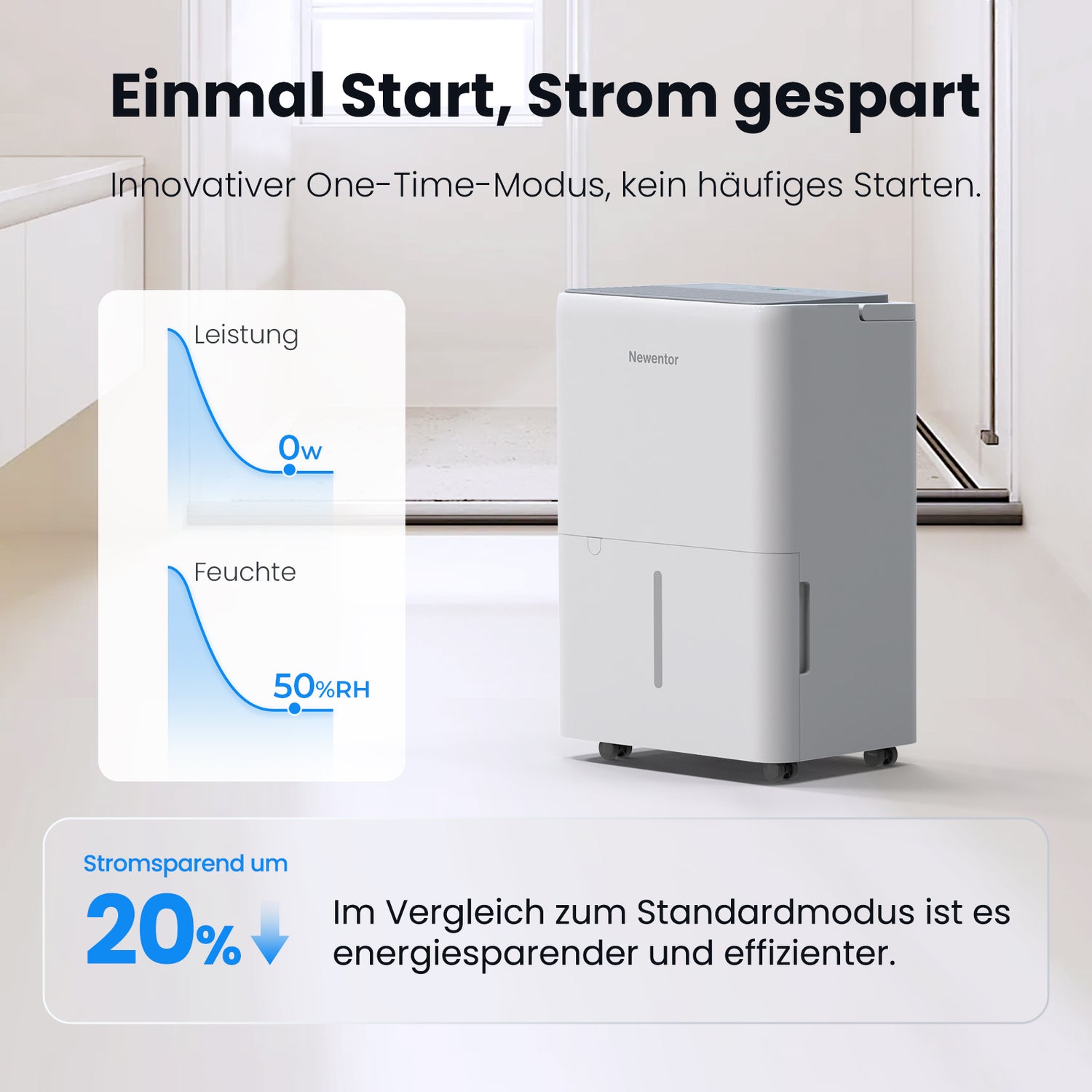 Wenn die gewünschte Luftfeuchtigkeit erreicht ist, schaltet sich der Luftentfeuchter automatisch aus. Einfache Bedienung und energieeffizienter!