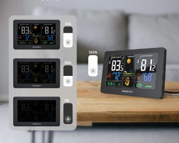Der Newentor Temperatur- und Feuchtigkeitsmonitor mit großem Farbdisplay zeigt umfassende Informationen an: Innen- und Außentemperatur, Luftfeuchtigkeit (max./min., hoch/niedrig), anpassbare Alarme, Uhrzeit/Datum, Wecker/Schlummerfunktion, Wettervorhersage (nächste 8–24 Stunden), Mondphase und Luftdruck.